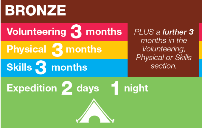 All activities should take approximately 1 hour a week (a total of a 3 hour commitment per week). The Bronze Award follows the below timescales.