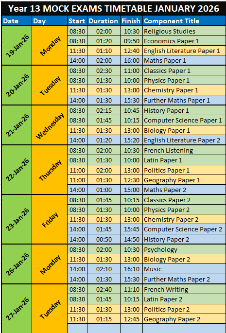 YEAR 13 MOCK EXAMS TIMETABLE JANUARY 2026