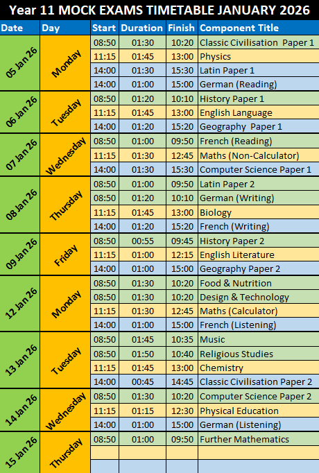 YEAR 11 MOCK EXAMS TIMETABLE JANUARY 2026